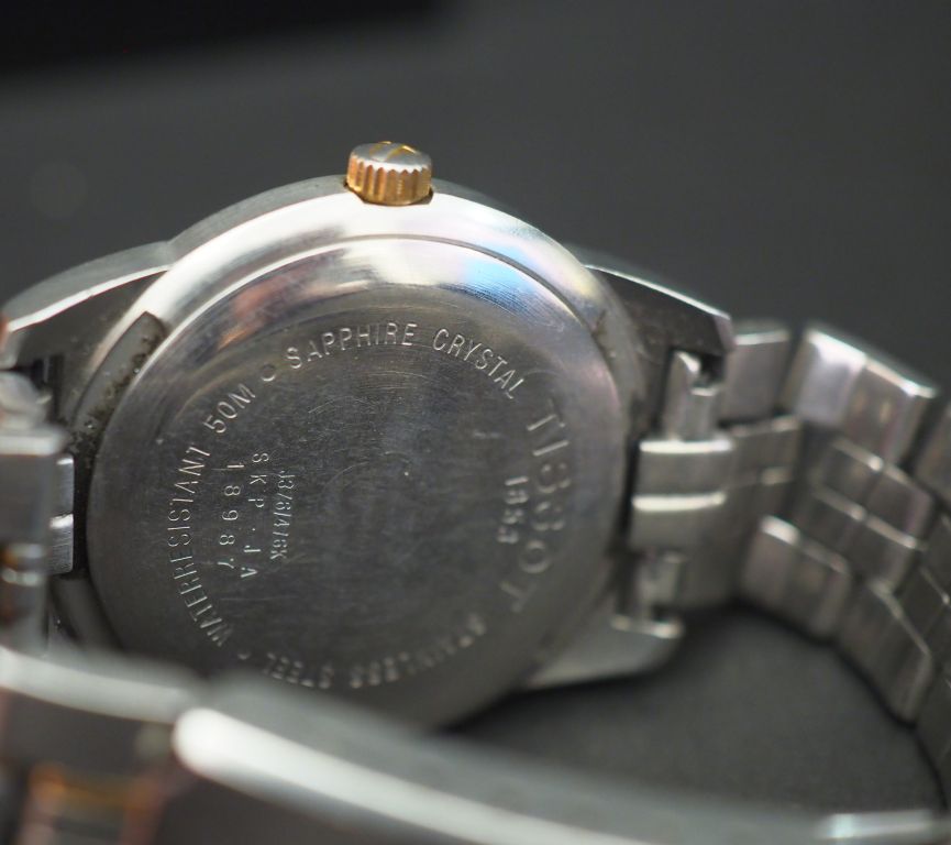 TISSOT, 1853. PR50 Montre bracelet en acier et métal doré. Cadran rond à index batons pour les heures. Guichet dateur à 3h. Bracelet à boucle déployante. Signée. Numérotée J376 / 476 K - SKP JA - 18987 (usures)