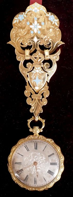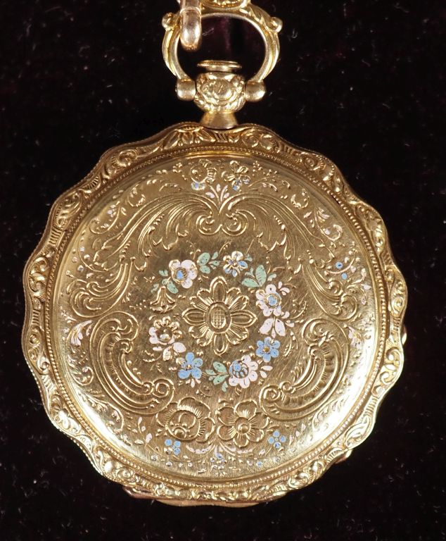 TRAVAIL FRANÇAIS N° 3268 Deuxième moitié du XIXème siècle. Montre de gousset en or jaune 750 et émail avec une châtelaine assortie, la spatule en vermeil (800). Boîtier rond, ouverture sur charnière, cuvette en or, numéroté. Cadran argenté et guilloché, chiffres romains, aiguilles « Pomme », minuterie chemin de fer. Mouvement mécanique a remontage a clef (à réviser). Diam. 37 mm Hauteur de la châtelaine : approx. 7 cm Poids brut : 61,00 g. (l’ensemble) Avec un écrin d’époque monogrammé M.L.G. et signé « Lautier, Joaillier, Toulouse », une clef de remontage. Veuillez noter que cette montre est vendue en l’état. Le mouvement ne fonctionne pas. Révision à prévoir. Bel état de préservation, quelques griffures. Cadran patiné et légèrement oxydé. Petits sauts d'émail. Veuillez noter que toutes les montres sont vendues en l’état. Aucune garantie sur l’état de fonctionnement. La plupart des montres ont été ouvertes pour identifier le type et la qualité du mouvement, y compris les montres résistantes à l’eau. Il est conseillé à l’acheteur de consulter un horloger pour revoir l’étanchéité de la montre. Les indications données sur l’existence d’une restauration, d’un accident ou sur l’état de préservation restent soumises à l’appréciation personnelle des acquéreurs. L’absence d’indication de pièces de remplacement, d’une restauration ou d’un accident n’implique nullement qu’un bien soit exempt de tout défaut présent. Tous les objets présentés sont susceptibles d’avoir fait l’objet d’un service antérieur et peuvent présenter des pièces non d’origine. Les dimensions et le poids des objets sont renseignés à titre approximatif. EXPERT : ADER WATCHES assisté de Justine LAMARRE