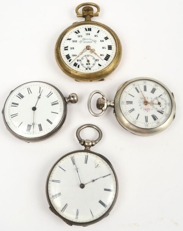 Trois montres de gousset en argent. Poids tel : 170 g. On y joint une montre de gousset en métal