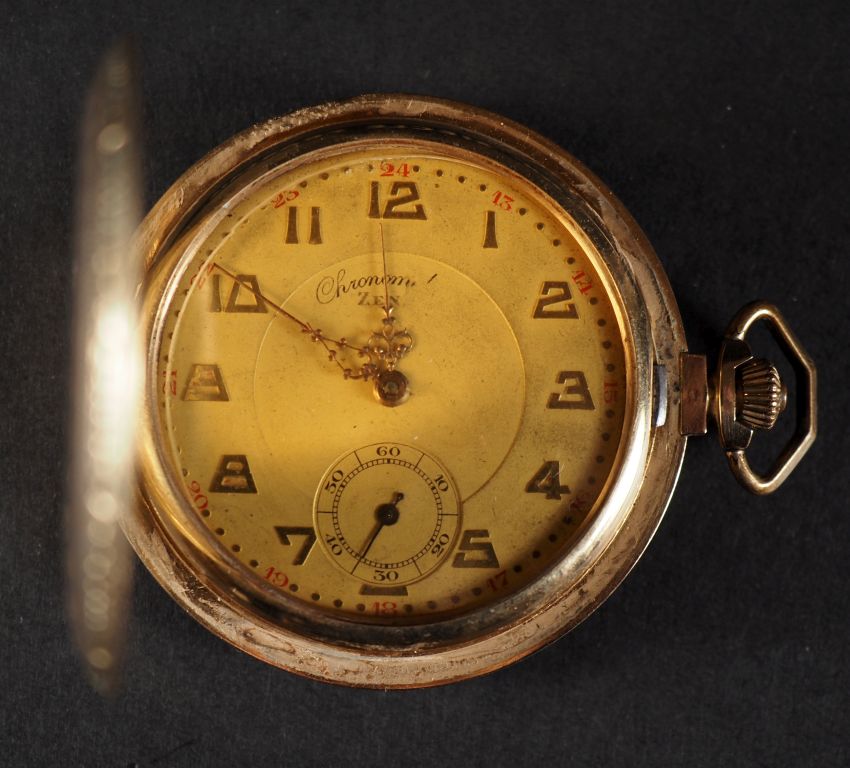 ZENITH (?) Montre de poche chronographe aveugle en or jaune 585. Cadran à chiffres arabes pour les heures. Compteur pour les secondes à 6h. L'avant et le revers, à décor d'un écusson et de bandes géométriques. Double fonds en métal doré. Signée sur le cadran. Diam. 51 mm Poids tel. 76,09 g (plastique protégeant le cadran à refixer ainsi que la lunette, marque en partie effacée sur le cadran, usures) Vendue en l'état, sans garantie.