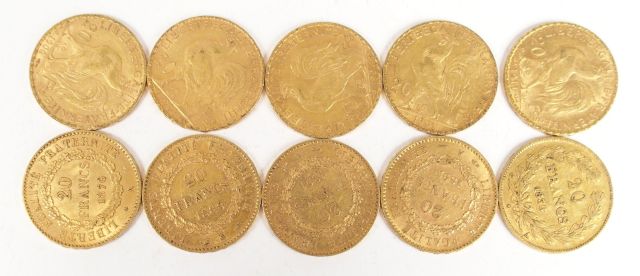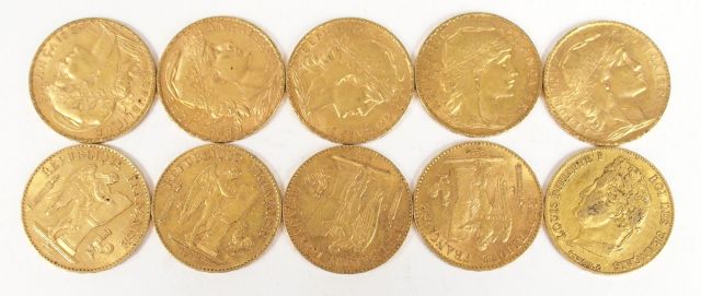 10 pièces de 20 Francs or: - 4 x Génie, - 5 x Marianne, -1 x Louis Philippe Ier. Poids: 64,5gr