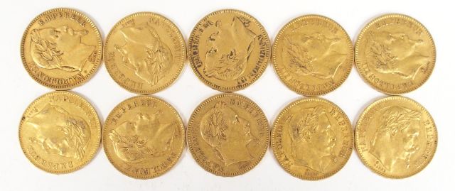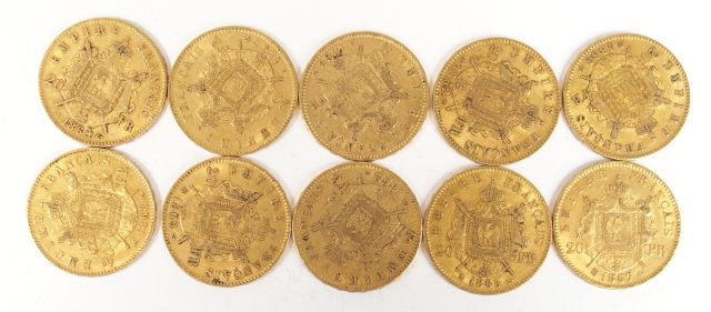 10 pièces de 20 Francs or, Napoléon III laurée. Poids: 64,4gr