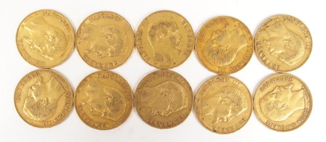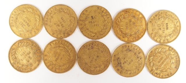 10 pièces de 20 Francs or, Napoléon III tête nue. Poids: 64,3gr