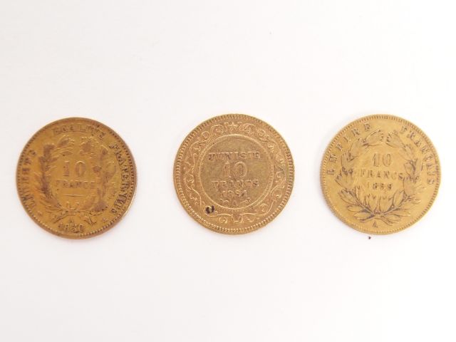 3 pièces de 10 Francs or: Napoléon III tête nue 1859-A, Marianne 1850-A et Tunisie 1891-A. Poids: 9,5gr