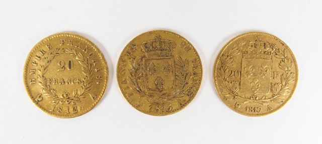3 pièces de 20 Francs or: -Napoléon Empereur, tête laurée, 1812-Paris, -Louis XVIII 1815-Paris, -Louis XVIII 1817-Paris. Poids: 19,2gr