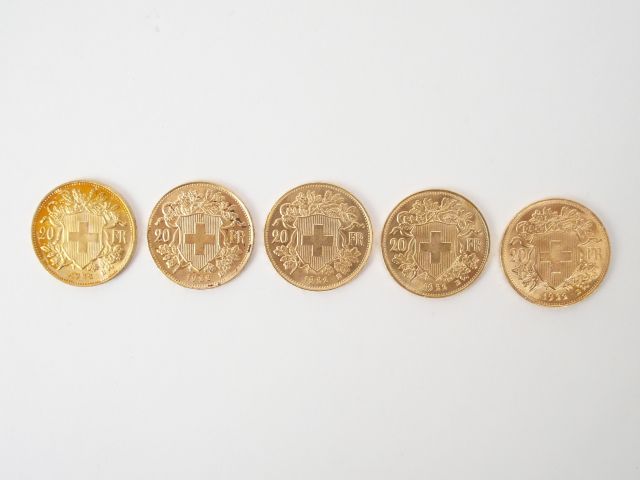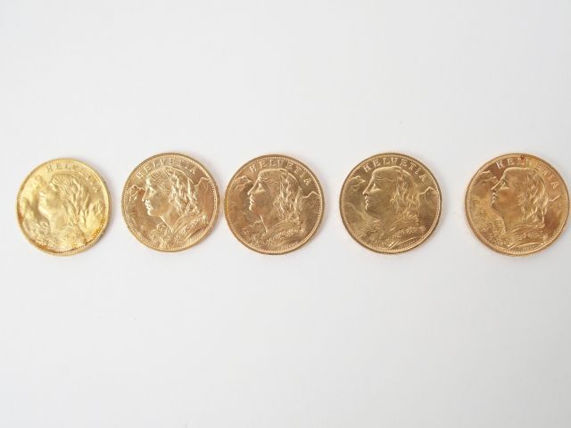 Lot de 5 pièces de 20 Francs suisse or, Croix Suisse. Poids: 32,3gr au prix de 800 à 1000 € en vente aux enchères par l'hôtel des ventes Primardeco