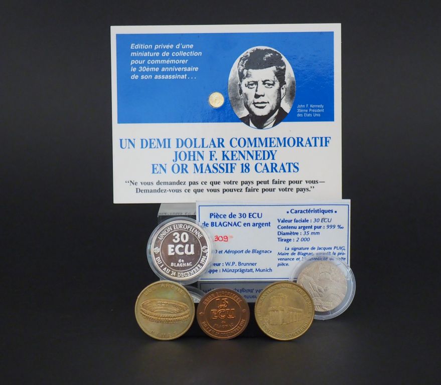 6 pièces dont : - 30 Ecu de Blagnac - 1,5 Ecu de Blagnac - Monnaie de Paris Nimes - Monnaie de Paris Les Saintes - 1 pièce Futuroscope - 1/2 dollar commémoratif en or John Kennedy