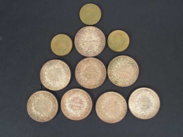 8 pièces de 10 Francs argent, Hercule. On y joint 3 pièces métal de 10 Francs. Poids: 230gr