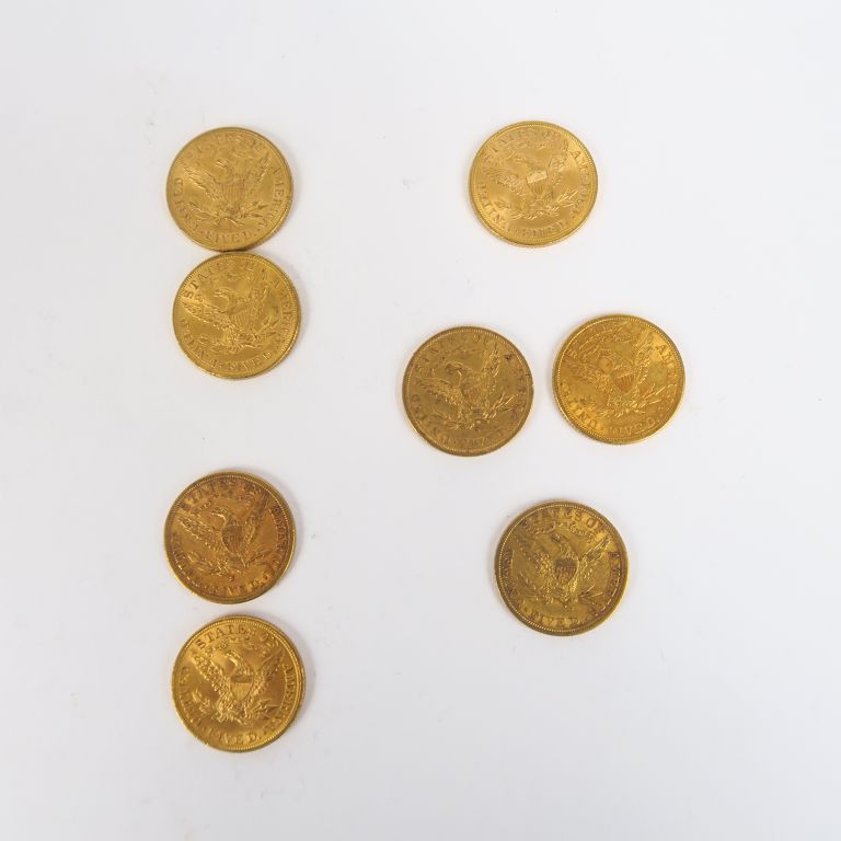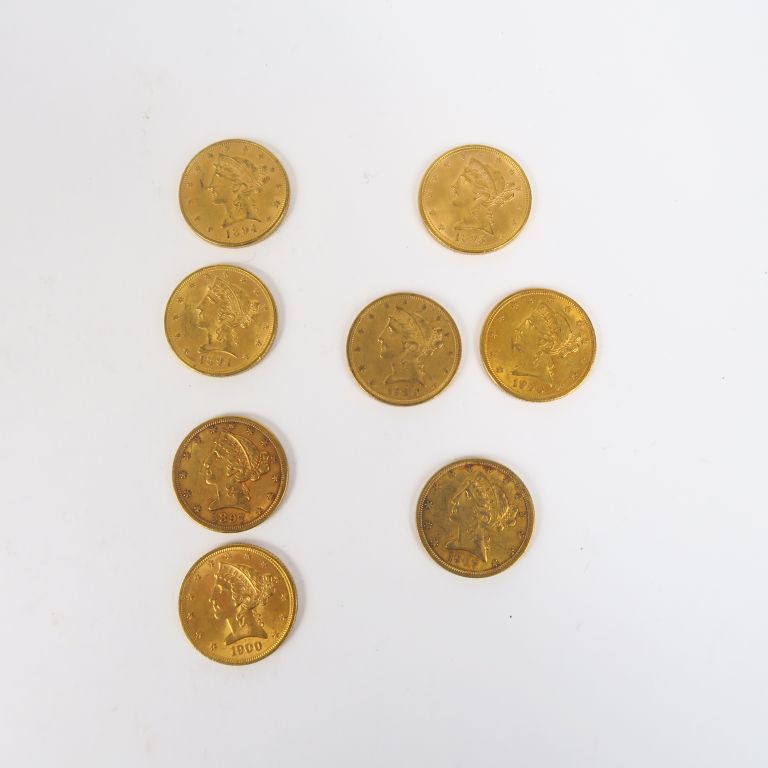 8 pièces de 5 dollars or, 1893, 1894 (x2), 1897, 1900, 1906 (x2), 1907. FRAIS ACHETEURS : 5% TTC