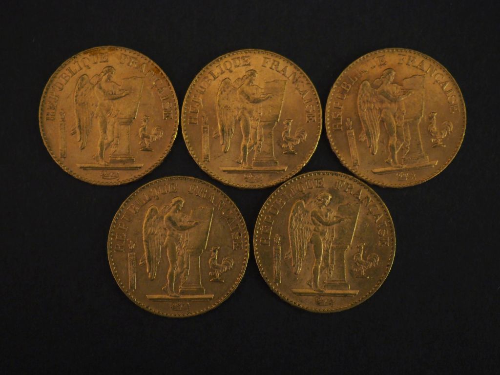 Cinq pièces de 20 Francs or, 1895-A et 1897-A (x4). FRAIS ACHETEURS 10% HT.