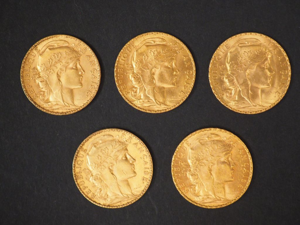 Cinq pièces de 20 Francs or, 1904, 1907, 1908, 1910 et 1911. FRAIS ACHETEURS : 5% TTC