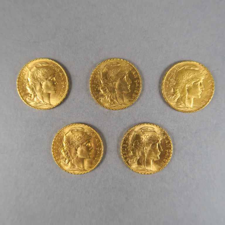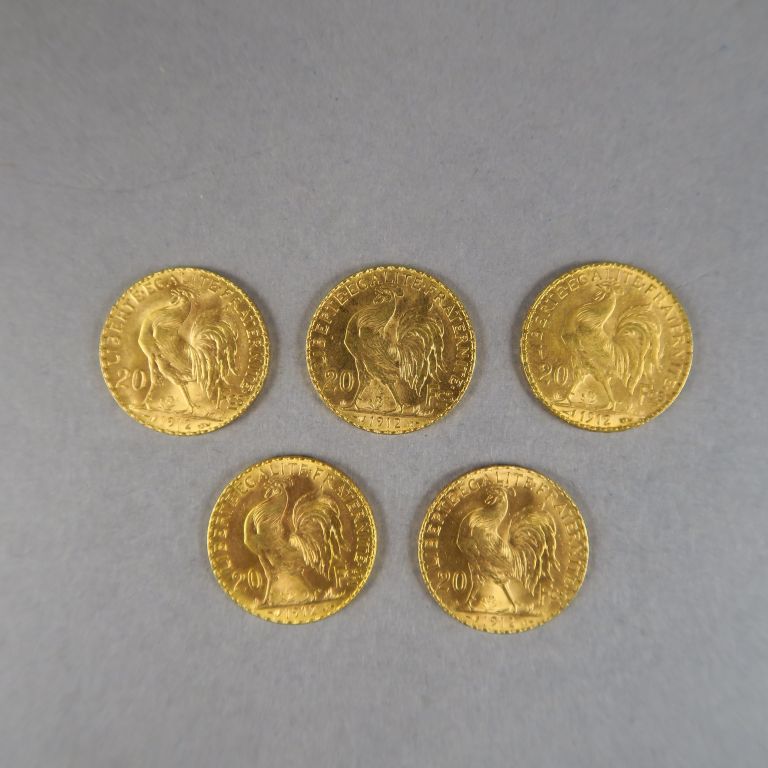 Cinq pièces de 20 Francs or, 1912. FRAIS ACHETEURS : 5% TTC