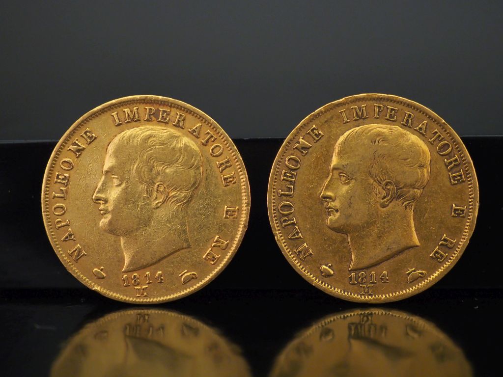 Deux pièces de 40 Lire or, Napoléon empereur, 1814-M.