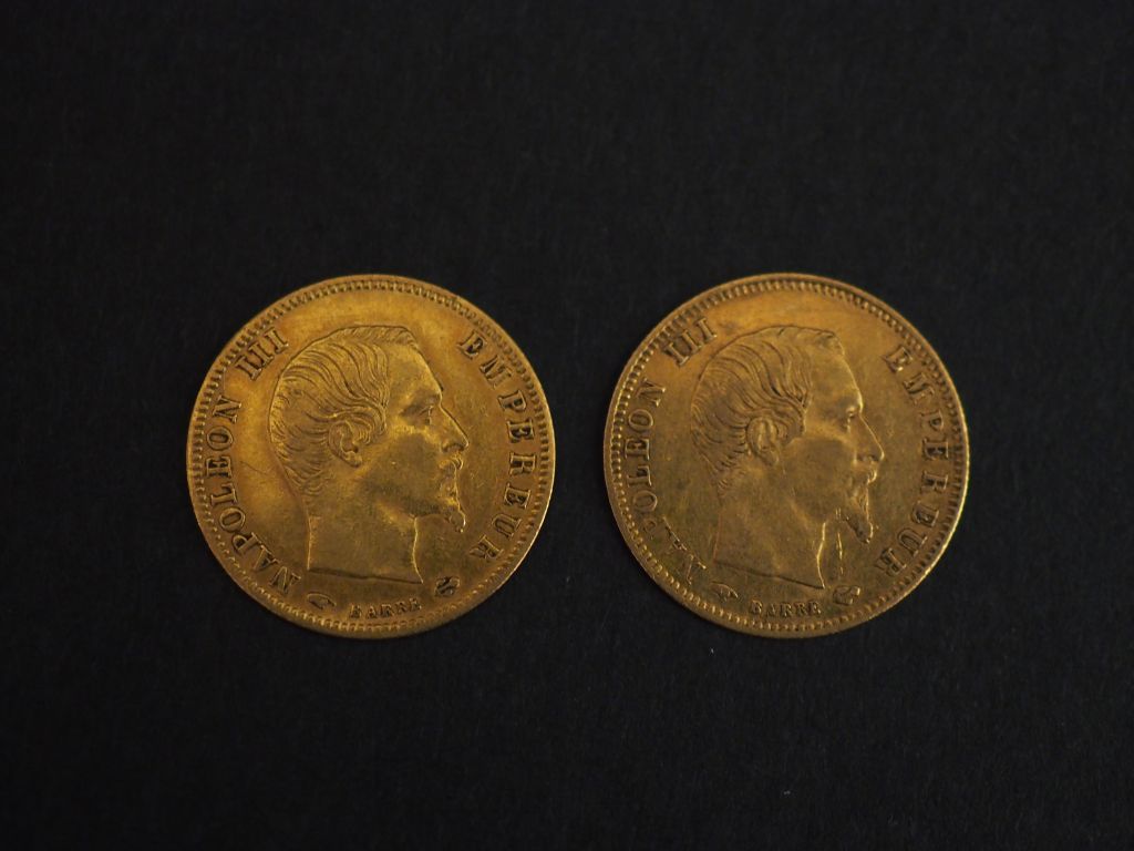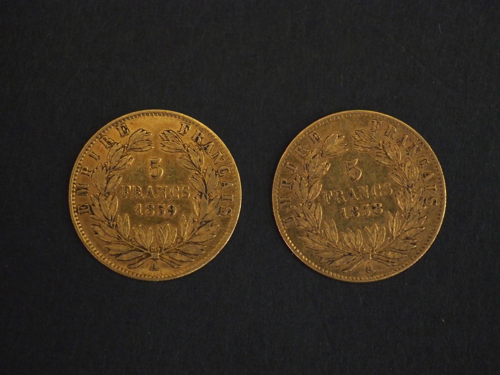 Deux pièces de 5 Francs or, 1858-A et 1859-A. FRAIS ACHETEURS 5% TTC.