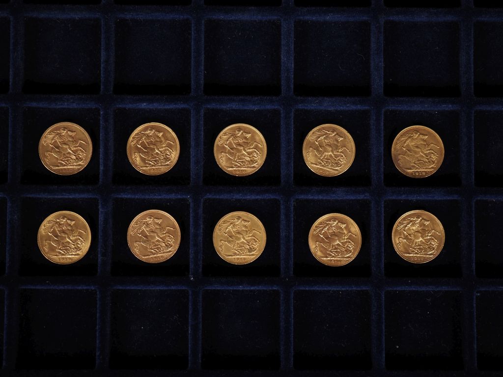 Dix souverains or, 1910, 1912, 1918, 1914, 1917, 1918 (x3), 1919, 1922. FRAIS ACHETEURS 10% HT.