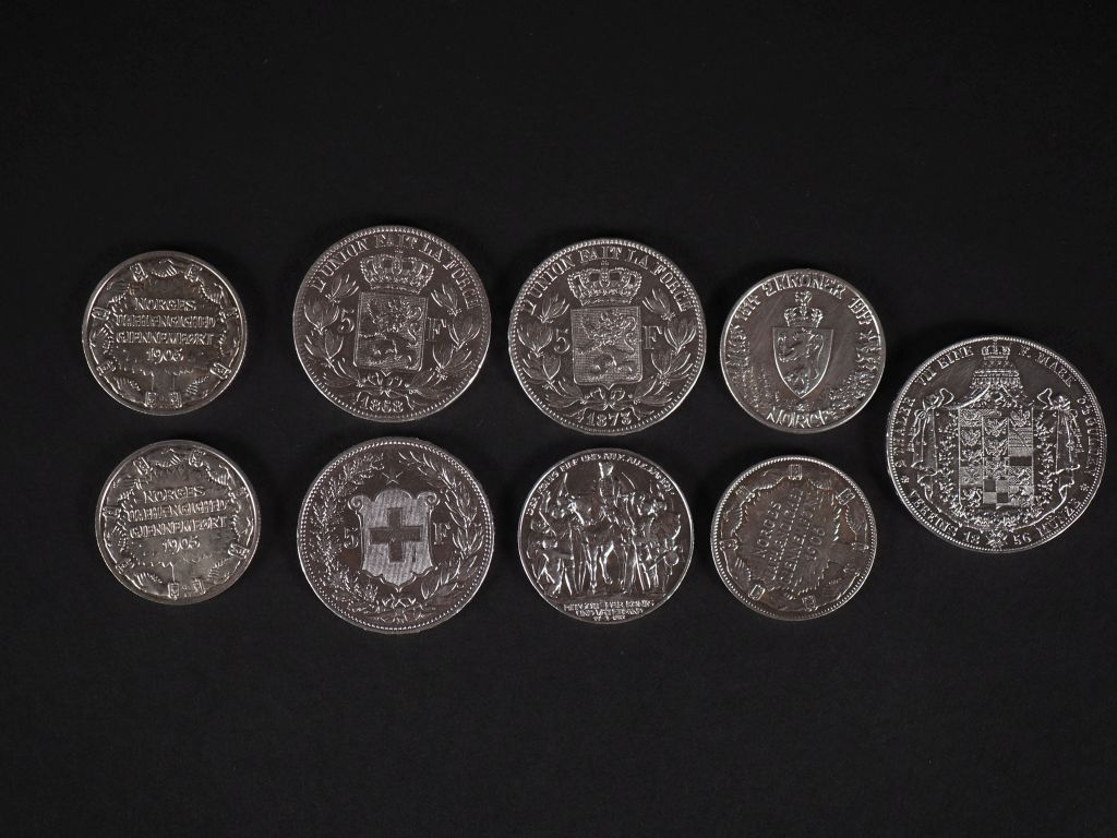 Ensemble comprenant : - deux pièces de 5 Francs belge en argent, 1868 et 1873. - une pièce de 5 Francs suisse en argent, 1909. - une pièce de 3 1/2 Gulden en argent, 1856. - une pièce de drei mark en argent, 1913. - quatre pièces de 3 Kroner en argent, 1905 (x3) et 1914. Poids. 188,71 g