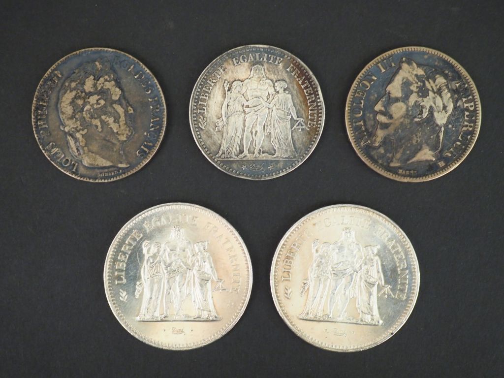 Ensemble comprenant : - deux pièces de 50 francs argent, 1976 et 1978. - trois pièces de 50 francs en argent, 1842, 1868 et 1875. Poids. 135 g