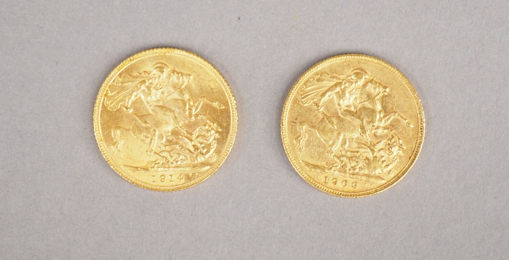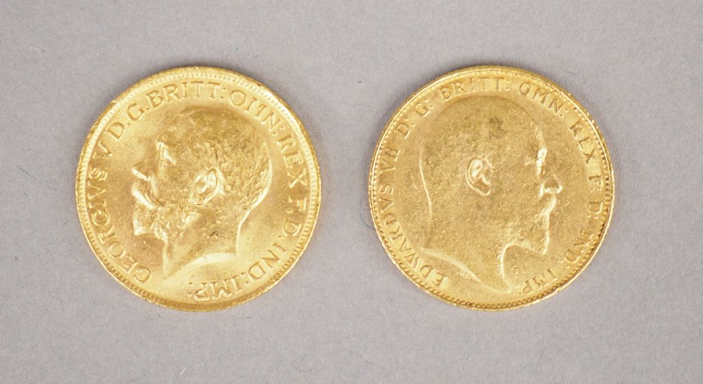 Ensemble comprenant : - Une pièce Georges V or, 1914. - Une pièce Edouard VII or, 1909 FRAIS ACHETEUR : 5% TTC.
