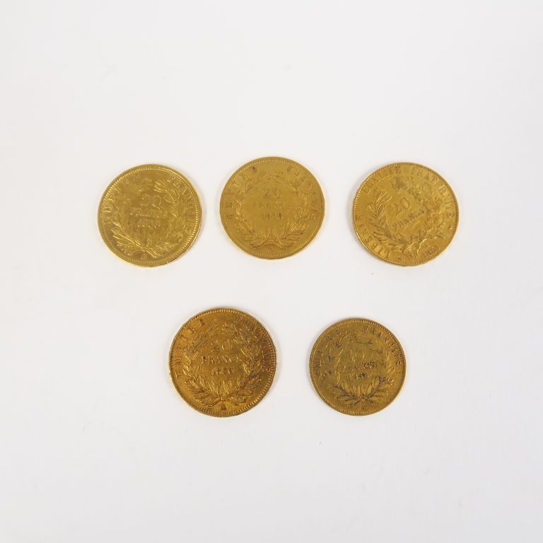 Lot comprenant : - une pièce de 20 Francs or 1851-A - une pièce de 20 Francs or 1856-A - une pièce de 20 Francs or 1858-A - une pièce de 20 Francs or 1860-A - une pièce de 10 Francs or 1858-A FRAIS ACHETEURS : 5% TTC