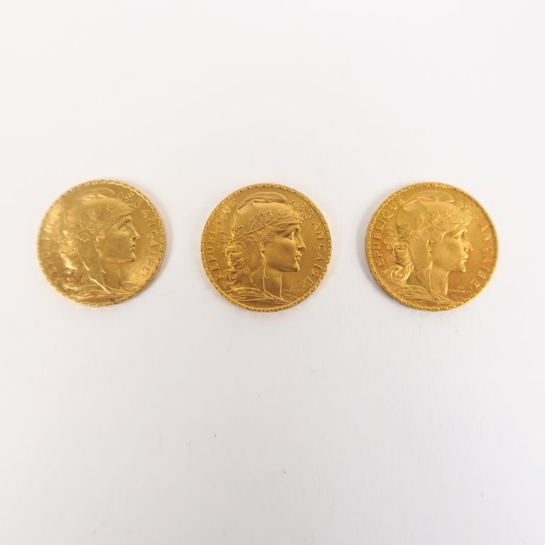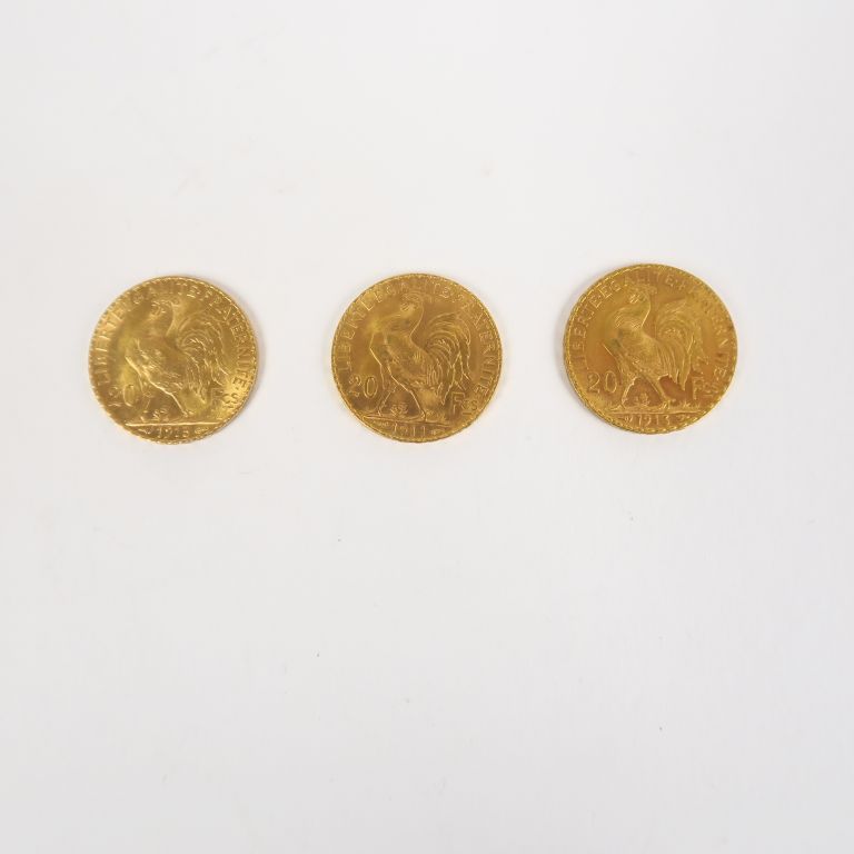 Lot comprenant : - une pièce de 20 Francs or 1911 - deux pièces de 20 Francs or 1913 FRAIS ACHETEURS : 5% TTC