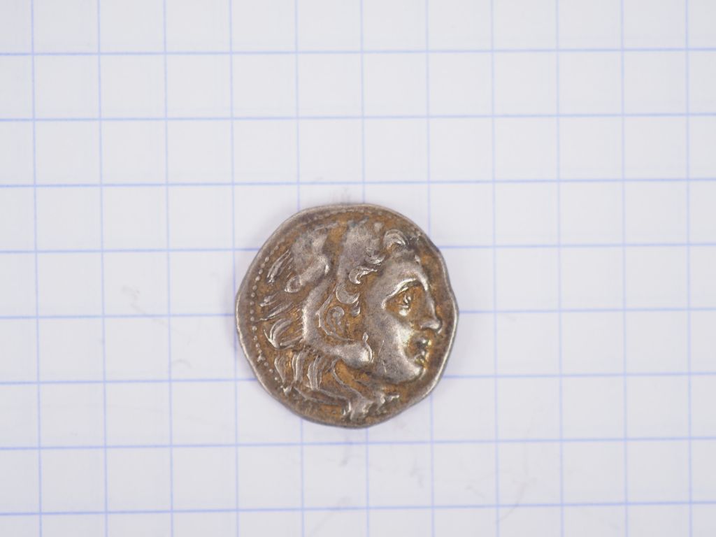 Macédoine. Drachme d’argent au nom d’Alexandre le Grand. Fin du IVe s. av. J.-C. A/Tête d’Héraclès sous les traits d’Alexandre coiffée de la léonté. R/ Zeus assis avec un sceptre. Un aigle sur sa main. TB à TTB