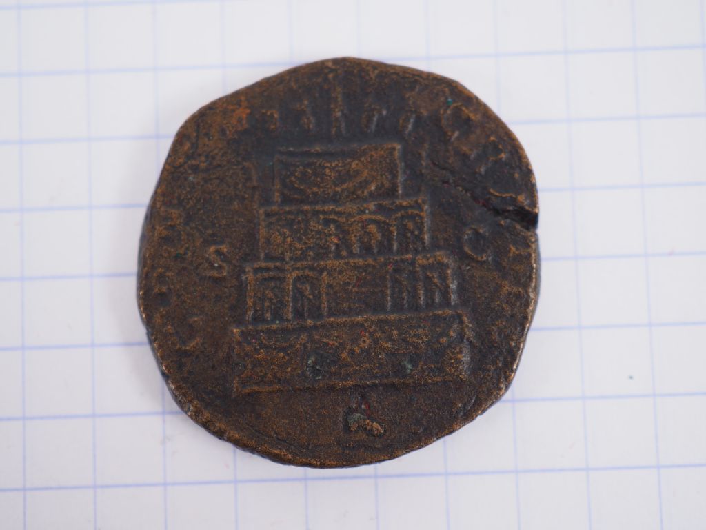 Marc Aurèle (+ 180 apr. J.-C.), sesterce commémoratif frappé sous Commode, A/ DIVVS ANTONINVS PIVS, tête à dr., R/ CONSECRATIO, bucher funéraire. B.