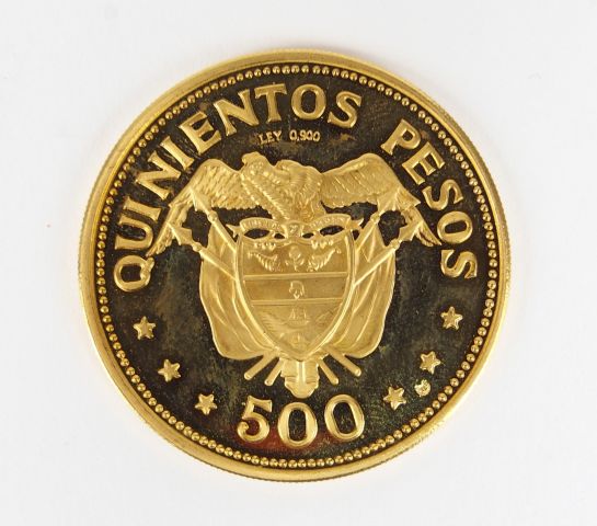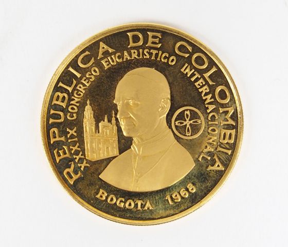 Pièce or 500 Pesos, 900/1000e, République de Colombie, Congrès eucharistique international de Bogota 1968. Diam. : 35mm Poids: 21,5gr