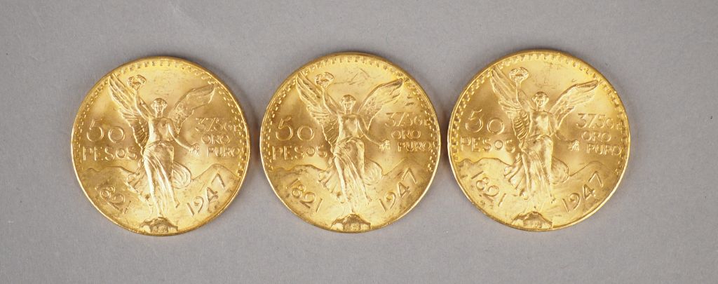 Trois pièces de 50 Pesos or. FRAIS ACHETEUR : 5% TTC