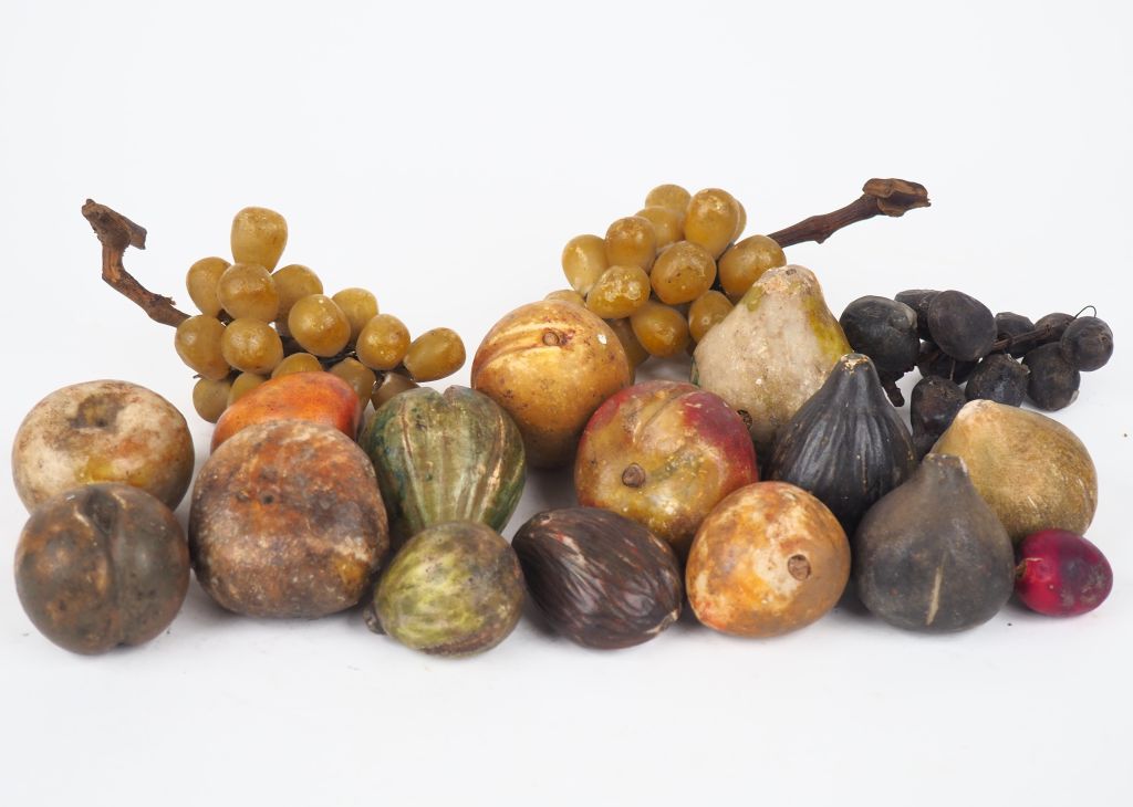 16 fruits XIXème en pierre polychrome : figues, raisins, prunes et poires. (quelques manques)