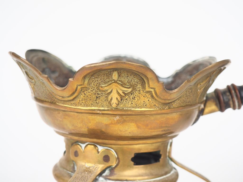 2 différents réchauds Louis XIV en cuivre jaune, manches en bois noirc...