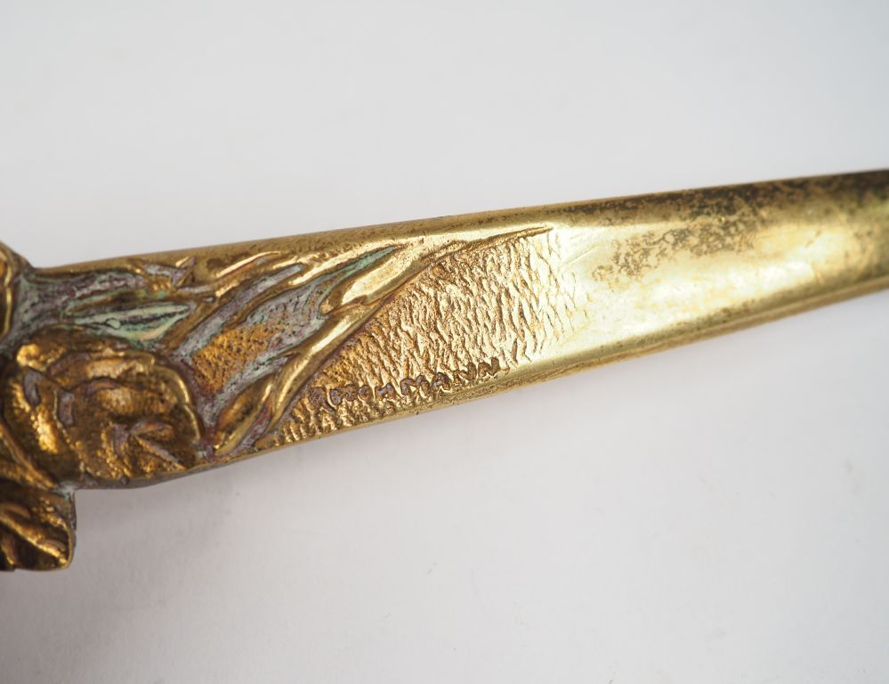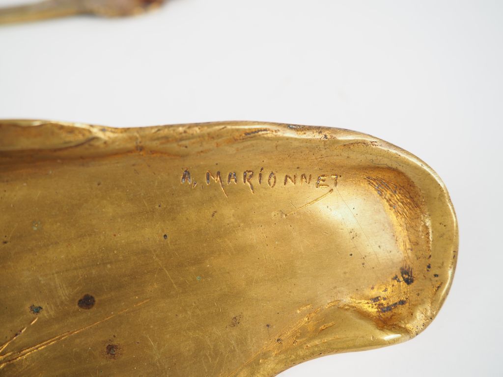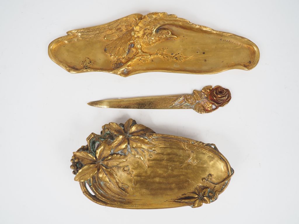 A. MARIONNET Deux vides poches Art Nouveau en bronze. Signés. 30 x 8 cm - 22 x 12,5 cm On y joint un ouvre lettre signé Roschmann.