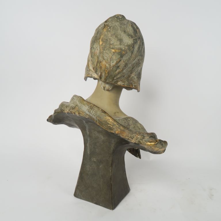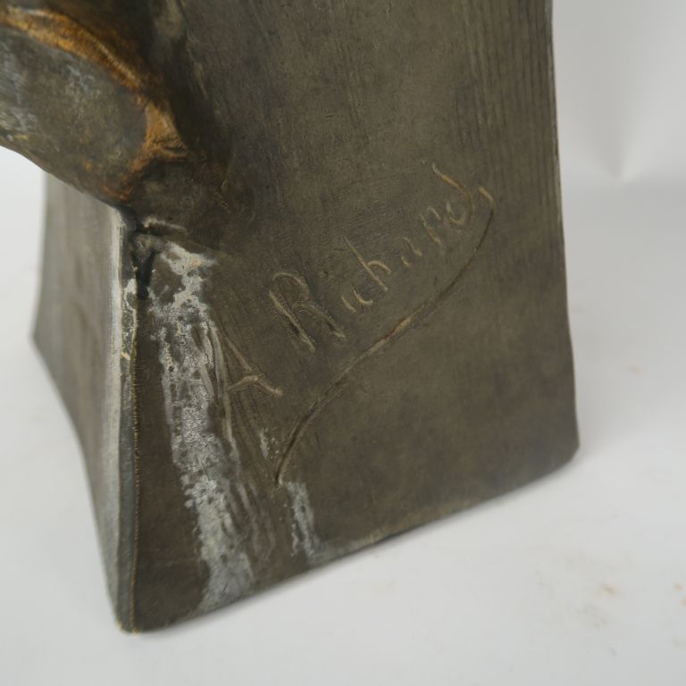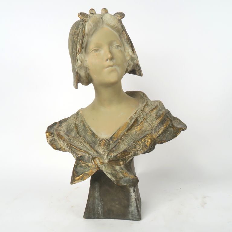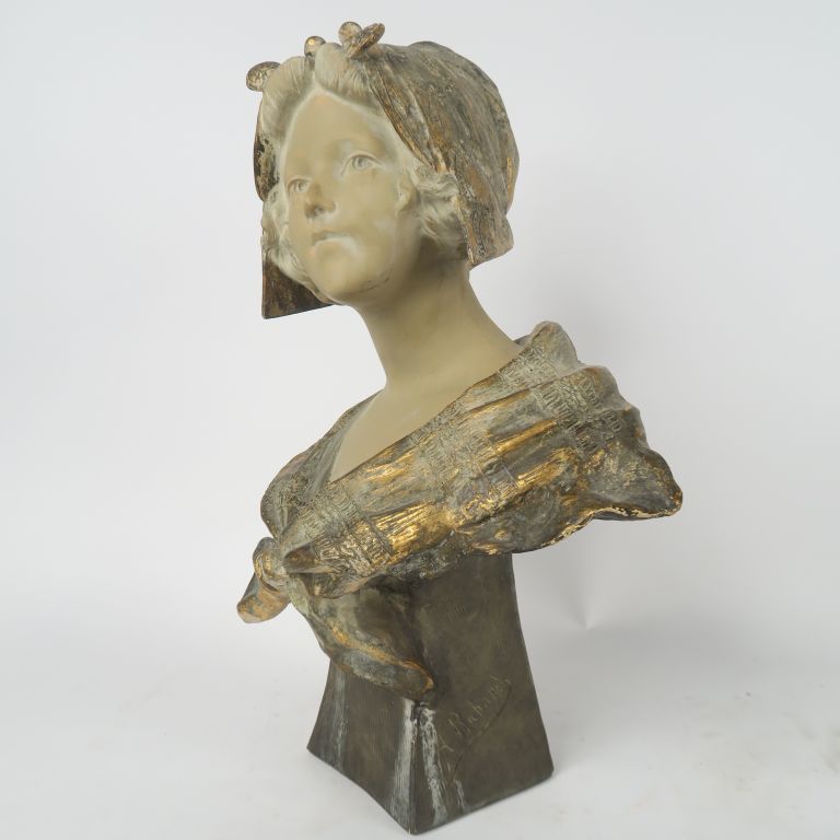 A. RICHARD. "Buste de jeune fille au fichu". Sculpture en plâtre polychrome et doré. Signée. H. 48 cm.