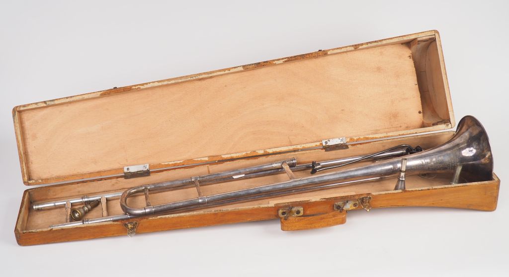Antoine COURTOIS. Trombonne à coulisse en argent. Signé Antoine Courtois, facteur du conservatoire national. Numéroté 3389. Dans son coffret en bois.