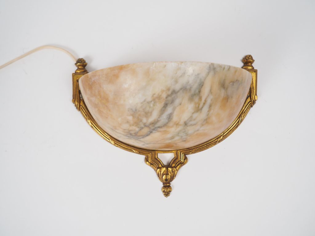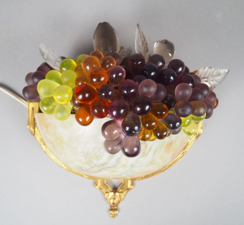 Applique 1940 de style Louis XVI en forme de corbeille de fruits en albâtre, bronze doré et verre polychrome. Largeur de l'applique : 22,5 cm