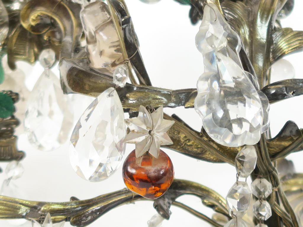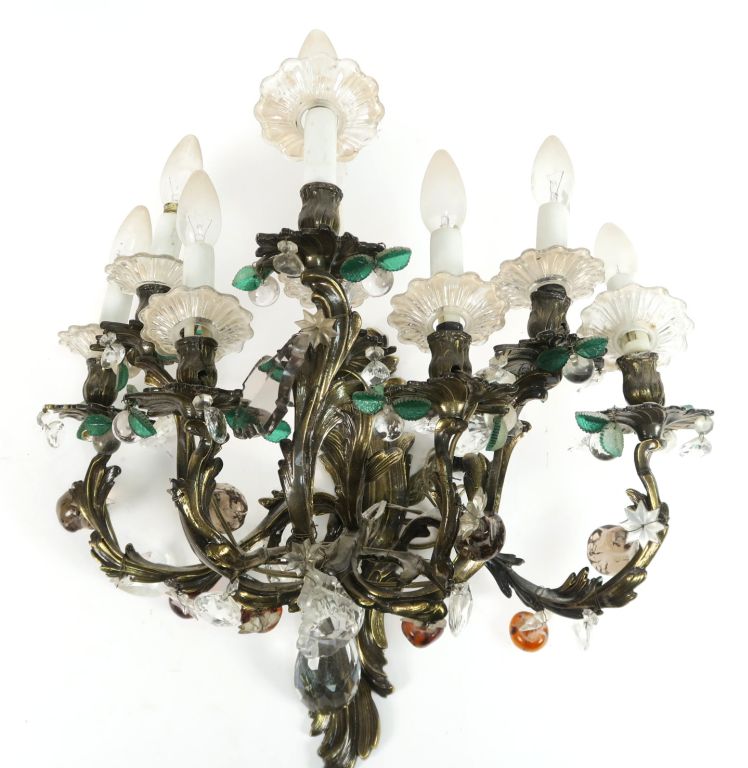 Applique de style rocaille en bronze et pampilles polychromes en forme de fruits. Eclairant à huit lumières. H. 42 cm