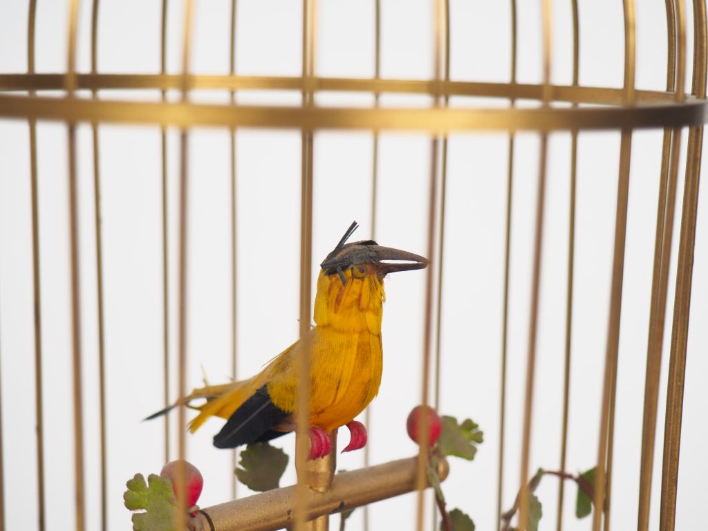 AU NAIN BLEU. Automate musical allemand "oiseau chanteur". H. 29 cm. (En état de fonctionnement).