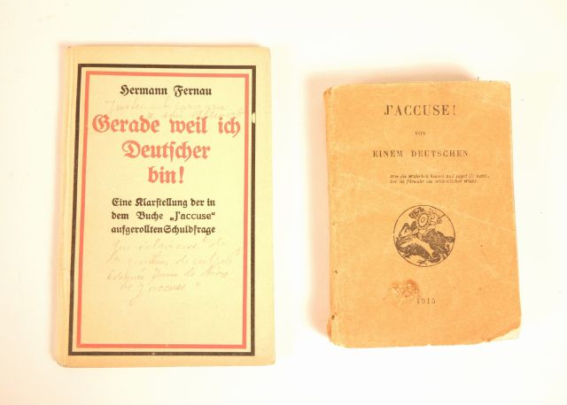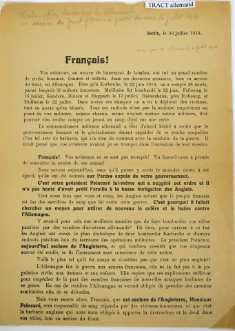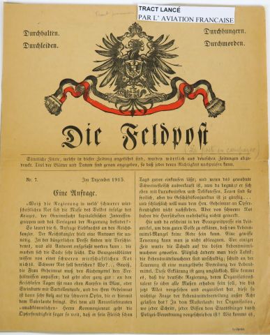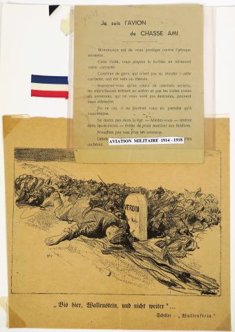 Aviation militaire 'Tracts aériens' : - deux ouvrages rarissimes : "J'accuse" (Von Einem Deutschen) et "Gerade weil ich Deutscher bin !" Ensemble de tracts lancés par les aviations française et allemande au cours du conflit 14/18 , on y joint différents documents, articles ou notes concernant la 'guerre des tracts' : - tract allié de propagande lancé par avion + carte postale (2) - tract lancé par l'aviation française 'Die Feldpost' - tract aérien lancé par Ballonets + tract 'die Feldpost' lancé en juillet 1916 - tract allemand rédigé en français (Berlin le 26,07,16) lancé en juillet 1916 - tract 'Je suis l'avion de chasse ami' + 1 tract 'Jusqu'ici Wallenstein, mais pas plus loin', ce tract suggère aux soldats du front allemand de Verdun qu'une borne limite leur avance sous peine de mort - tract lancé sur Angers par des avions américains le 27,10,18 pour s'inscrire à l'emprunt de la libération + 1 enveloppe cachet Groupe aérostation + 2 cartes postales - 5 cartes postales lancées sur Bruxelles par avions anglais 1918 - tract 'Die Feldpost' février 1916 - tract 'La voie du pays' du 19,01,1916 (pour les départements envahis' - tract en français lancé par les Allemands en juillet 1916 rédigé à Berlin le 26,07,1916 - tract 'aux populations de la France occupée' - ensemble de tracts 'Lettres à tous les français' - tract de 1917 écrit en allemand reprenant le discours du Président américain Wilson du 2,04,17 au congrès de Washington - tract 'L'origine des tracts aériens' - tract lancé par l'aviation française (article) - journal 'l'ami du peuple' 3 articles 'la guerre du moral' 11,08,1935- 14,08,1935 - 12,08,1935 - journal des mutilés et combattants dossier 'guerre des tracts' - documentation générale 'tracts aériens'