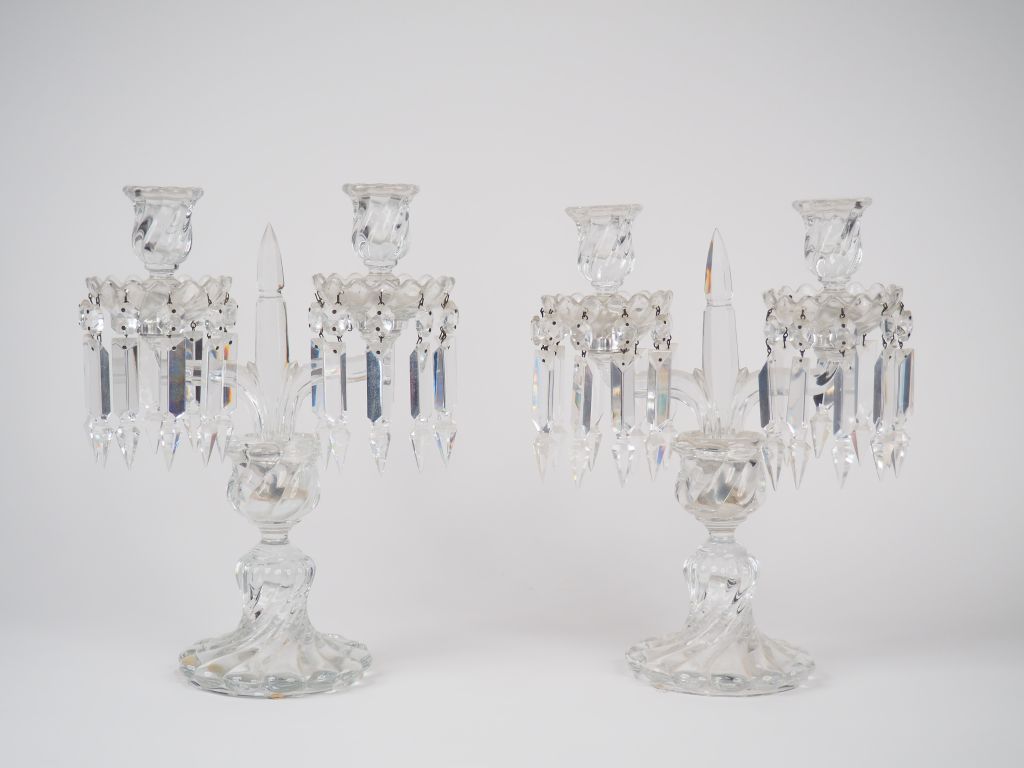 BACCARAT. Paire de girandoles en cristal éclairant à deux lumières. Signées. H. : 32,5 cm.