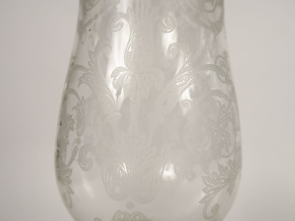 BACCARAT. Paire de photophores en cristal, à décor gravé de rinceaux feuillagés, pieds à décor de cotes torses. Signés. H. 40 cm