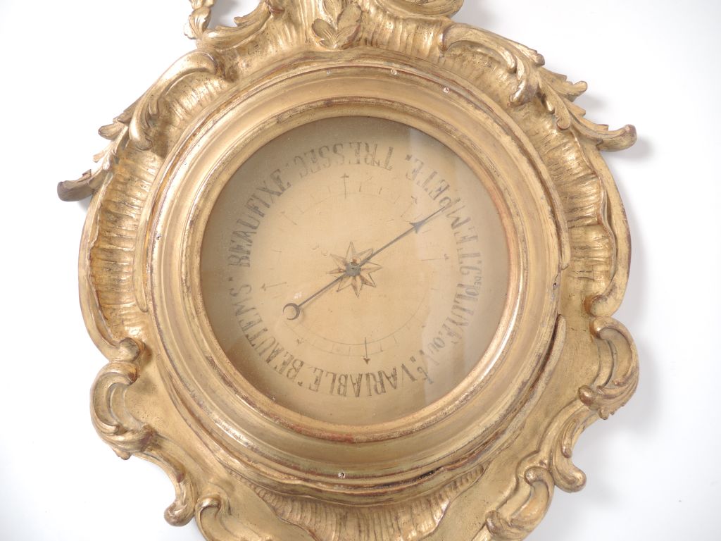 Baromètre de style Louis XV en bois sculpté et doré, à décor de feuillage et de coquille. H. 112 cm