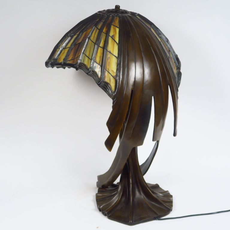 BEHRENS. Grande lampe de style Art Nouveau en bronze à patine brune et verre polychrome. Signée. H. 76 cm