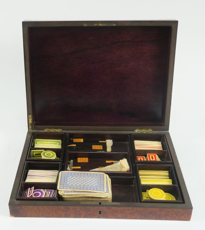 Boîte à jeux Napoléon III en marqueterie Boulle et son contenu de jetons en os polychrome. 6 x 31 x 23,5 cm