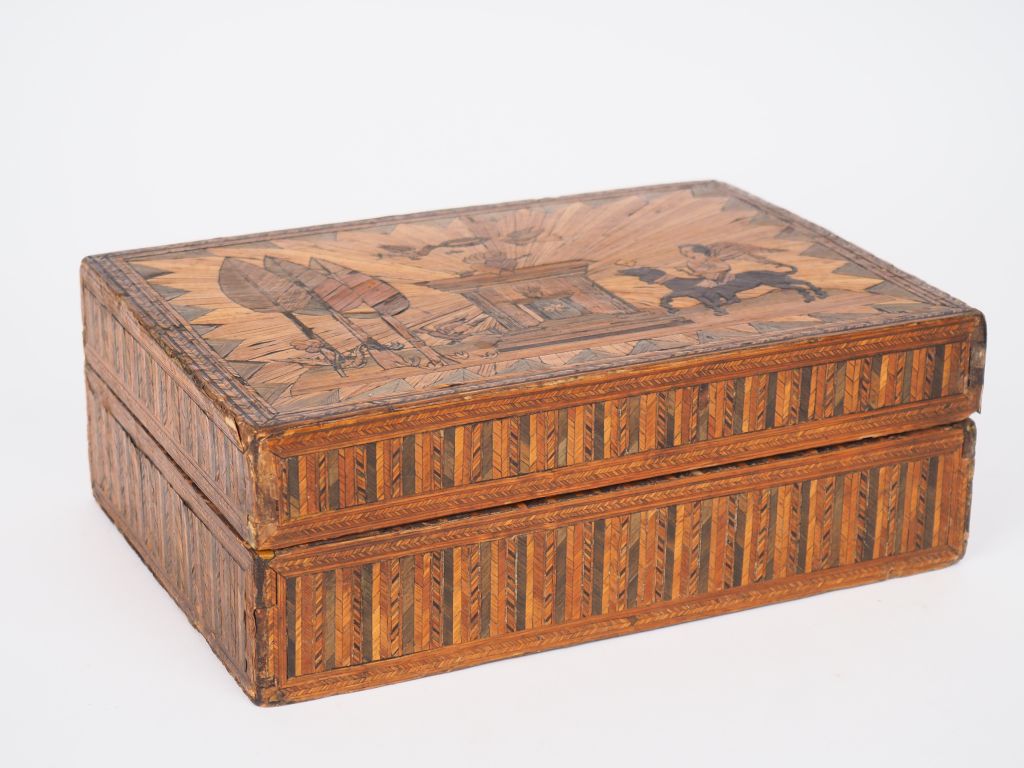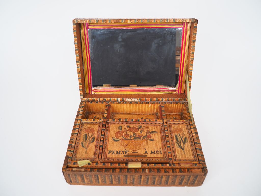Boîte début XIXème en marqueterie de paille, couvercle à décor symbolisant l'amour et la fidélité, intérieur à fond de glace (posterieur) titré "pensé à moi". Dim. 9 x 27,5 x 17,5 cm. (Petits accidents)