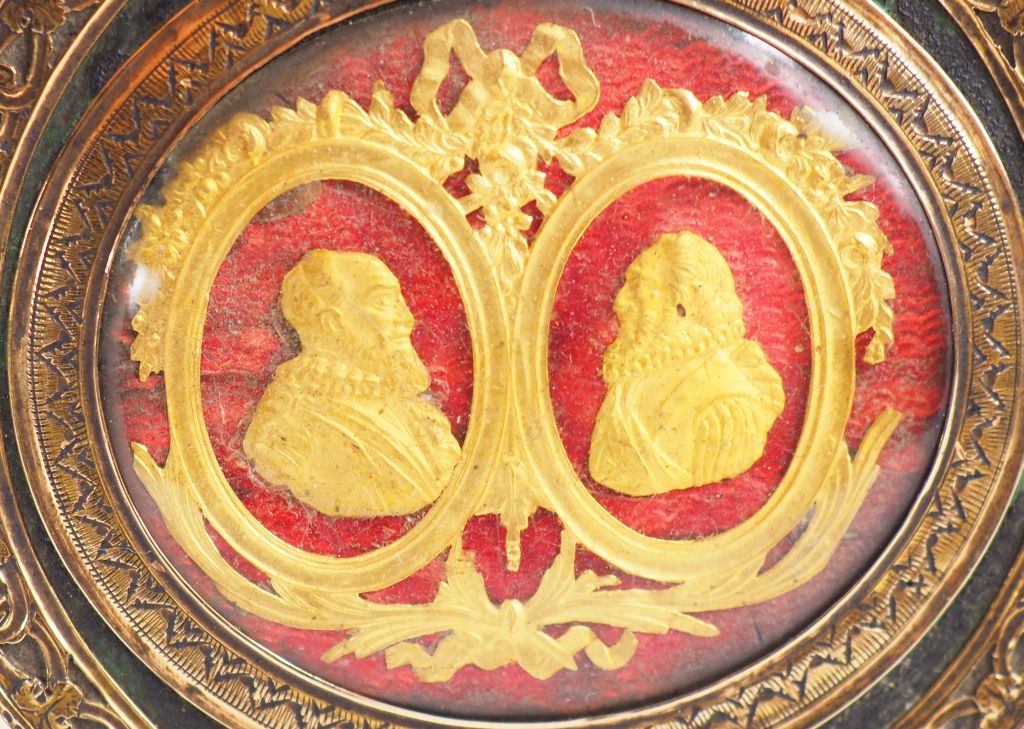 Boite Louis XVI en or, carton maché et écaille, couvercle orné des portraits d'Henri IV et Sully. Diam. 6,3 cm