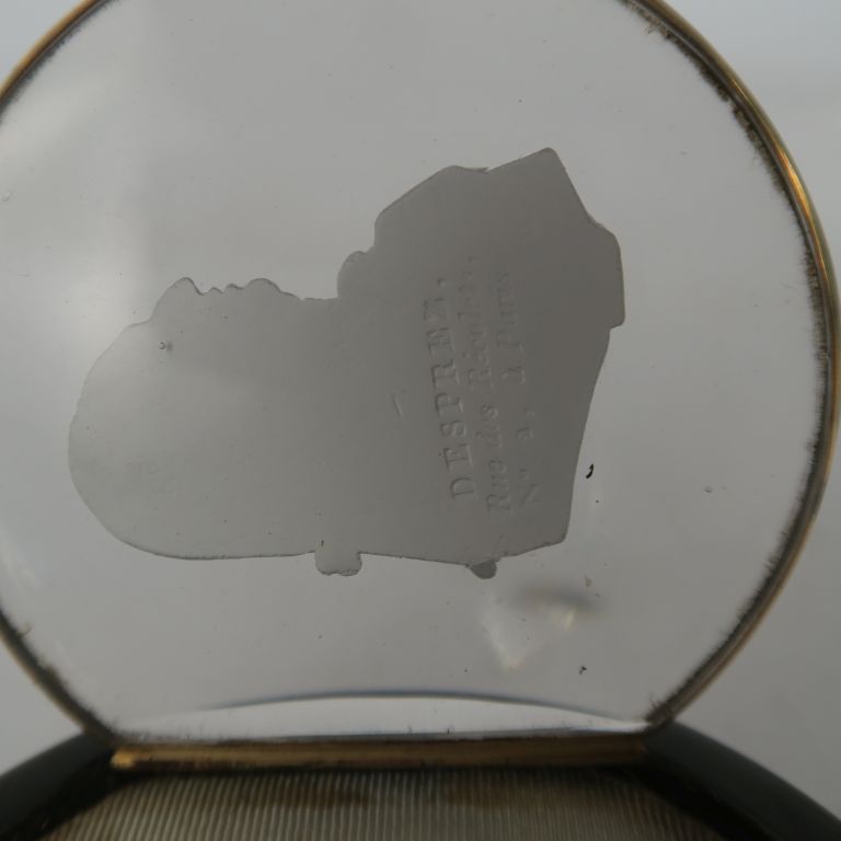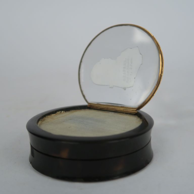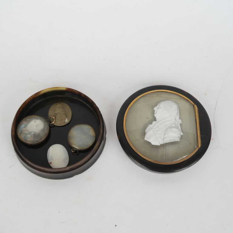 Boite ornée sur le couvercle d’un profil en cristallocérame du Roi Louis XVIII, ouvrant, monté à charnière, présenté sur fond de moire, signé « DESPREZ RUE DES RECOLETS n°2 A PARIS » A.B.E. (Traces d’insecte) Diam : 7 cm. On y joint quatre médaillons (usures) représentant le Roi Louis XVIII, le duc de Bordeaux ou Louis XVII.