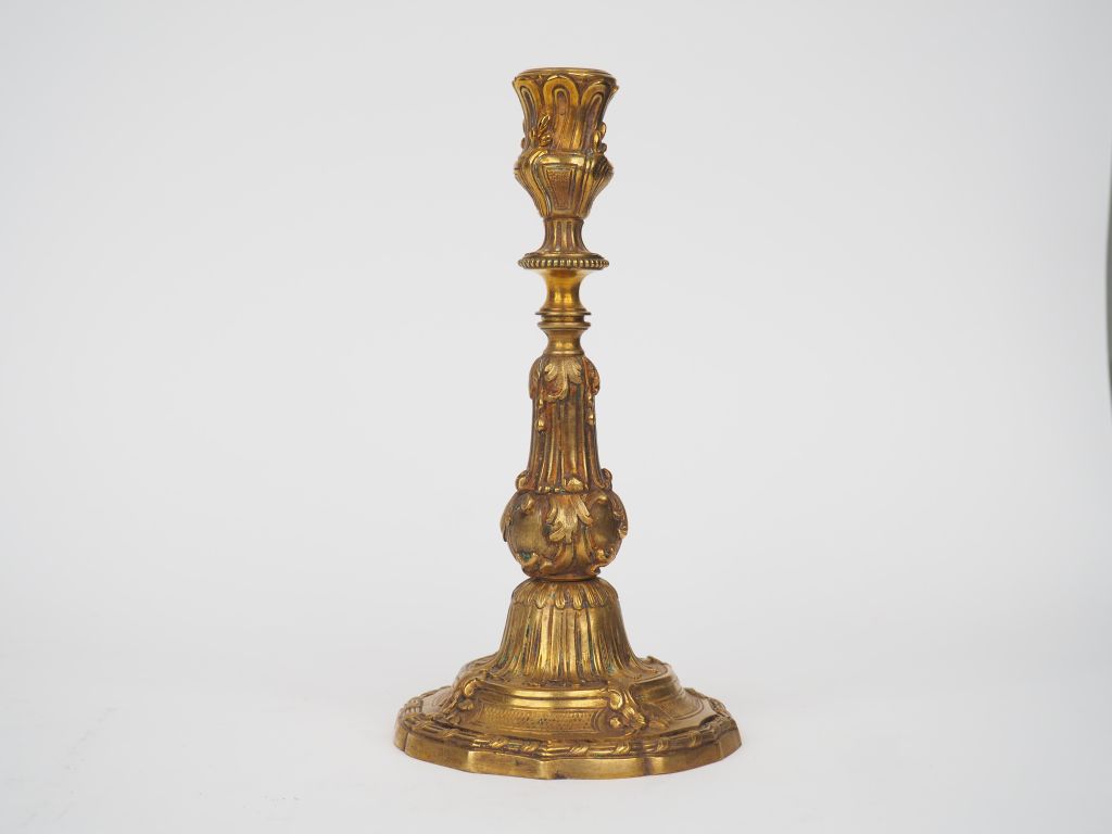 Bougeoir Napoléon III de style Louis XV en bronze doré à décor de fleurettes et de feuillage. H. 21,7 cm.