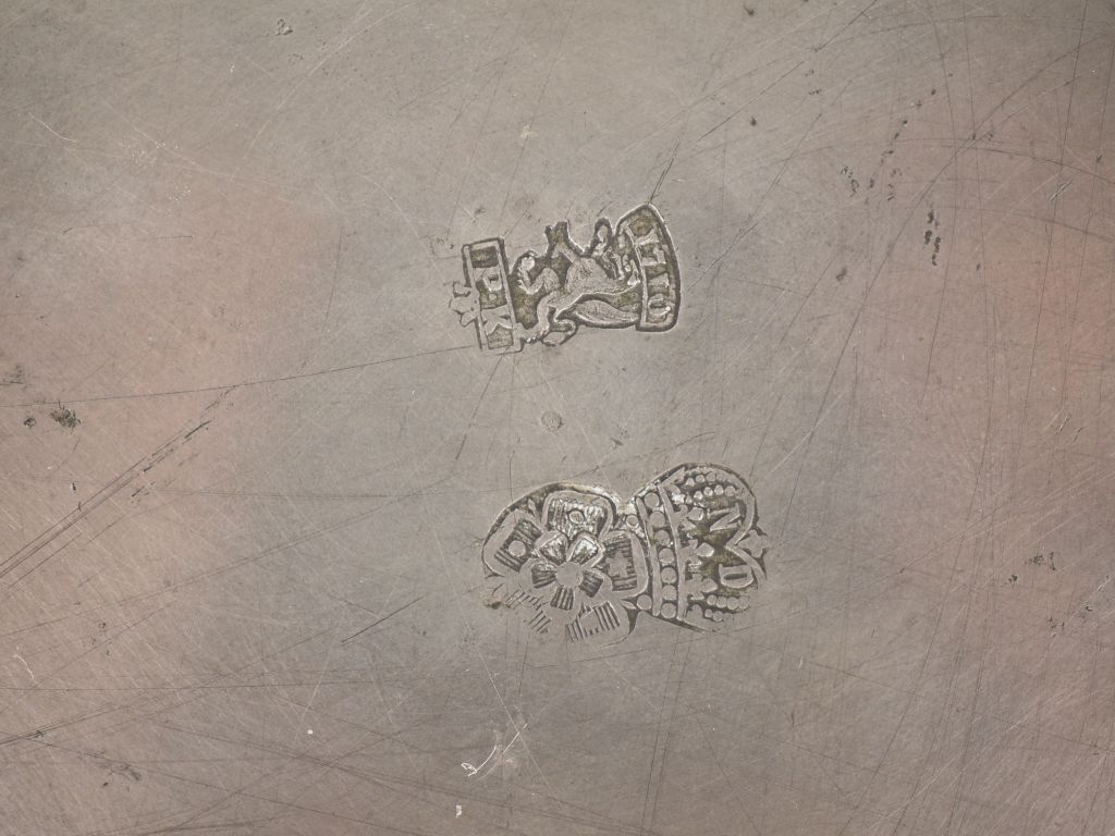 Bouillon Louis XV en étain à décor de rocailles, prise en forme de pomme de pin. Dim. 13 x 29 x 15,5 cm.