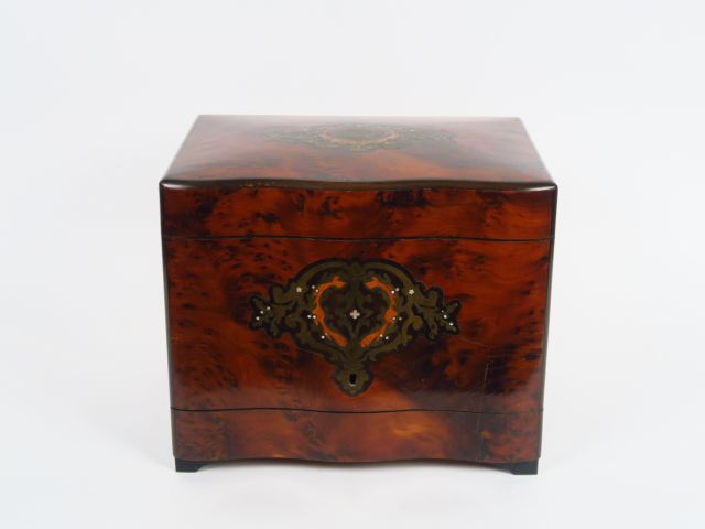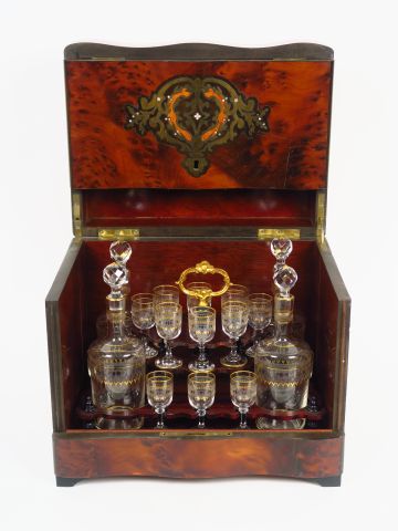 Cave à liqueur Napoléon III en marqueterie Boulle (complète et en bon état) Dim. 27,5 x 33 x 25 cm