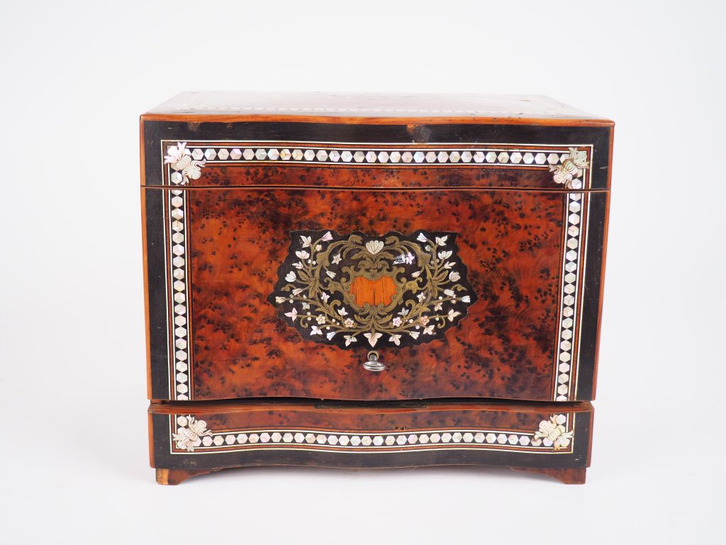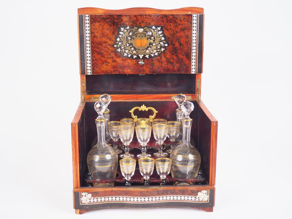 Cave à liqueur Napoléon III en marqueterie Boulle et incrustrations de nacre, intérieur en cristal à décor gravé de motifs géométriques et de liserés dorés. Comprenant : 14 verres et 4 flacons.