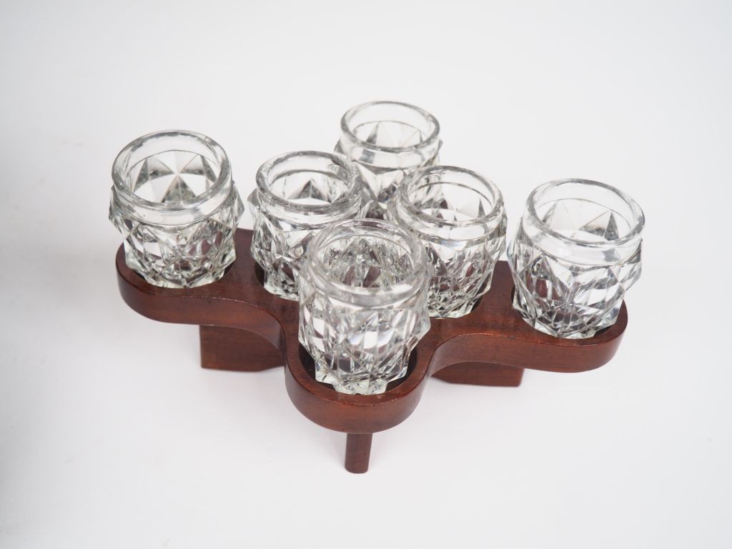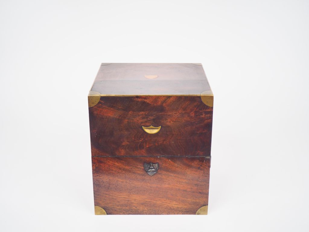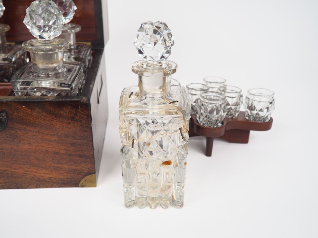 Cave à liqueur Restauration en acajou et cristal à décor de croisillons, comprenant quatre flacons et six verres. (un flacon accidenté, manque un écu à l'entrée de serrure, égrenures)
